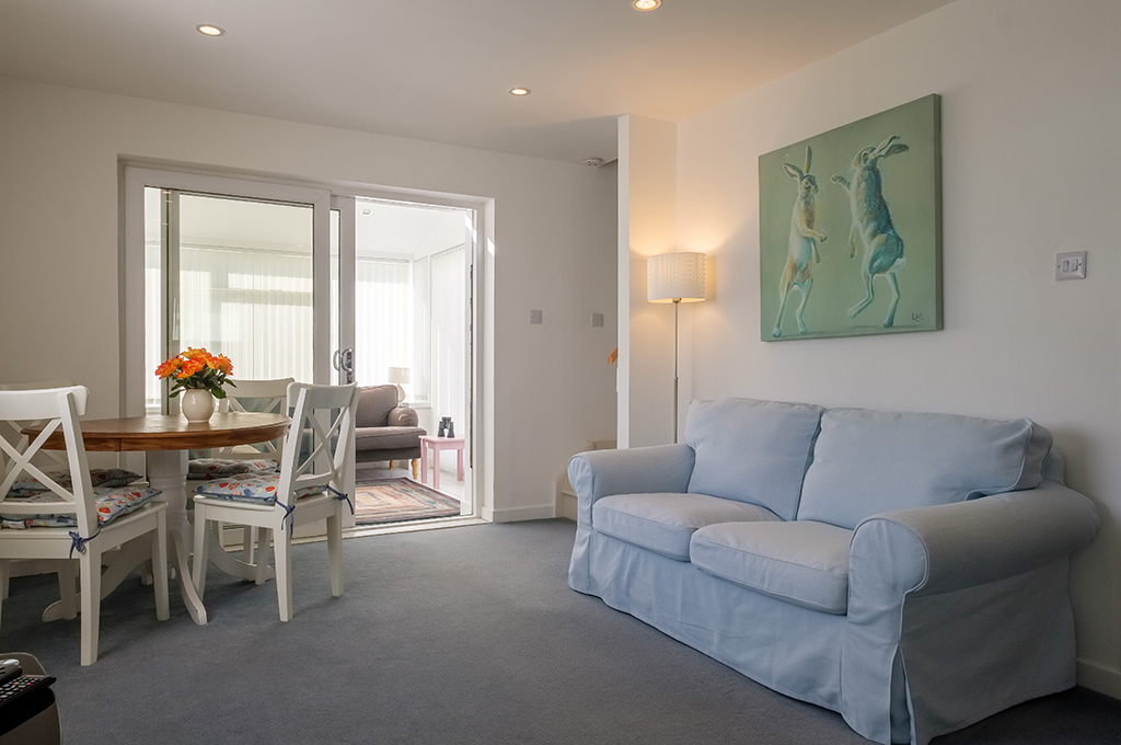 Sitting Room - with comfortable seating for four and dining table, flat screen television and a good selection of books and games. Leading into the sun-room with additional comfy seating - an ideal room for relaxing and watching the sunsets.